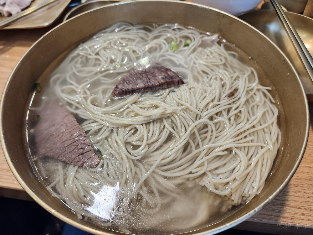 평양냉면의 슴슴한 맛. 쫄깃하지 않은 면발. 그리고 국물.
