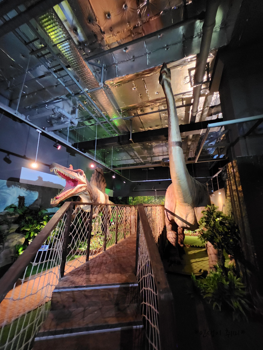 다이노베이의 하이라이트는 단연 '다이노 포레스트'예요. 이곳에 들어서는 순간, 마치 타임머신을 타고 공룡 시대로 돌아간 것 같은 느낌이 들어요. 너무나 생생한 공룡 모형들이 우리를 반겨주었죠.