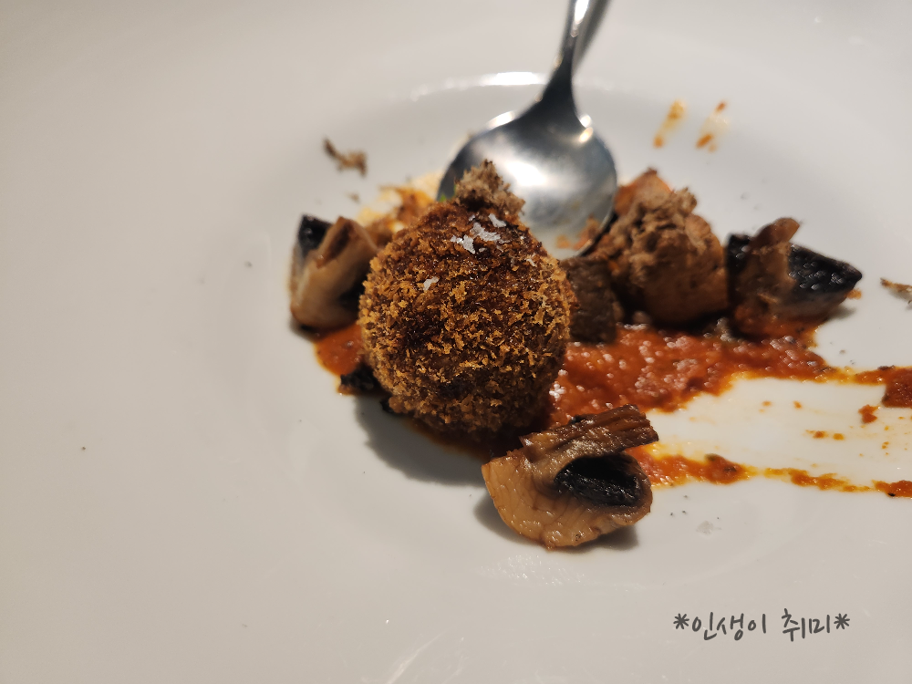 안에있는 고기가 부드럽고 맛있다. 조금 짭조름해서 와인이 절로 마셔진다