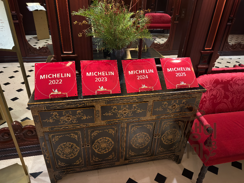 엘리베이터에서 내리면 입구에 미슐랭 가이드 플레이트가 2022년부터 2025년까지 나란히 놓여 있어요.