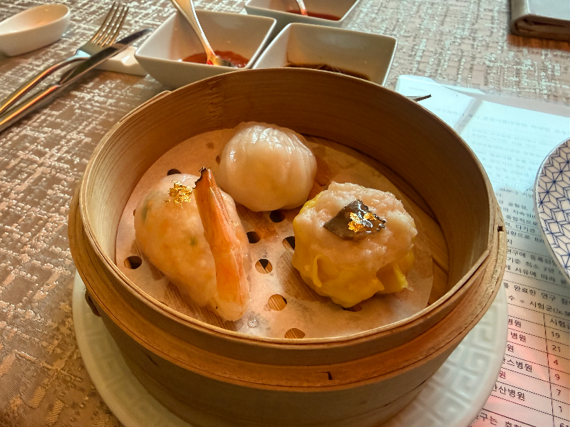 하교, 슈마이, 새우 딤섬 세 가지인데, 각각 위에 금박이 올라가 있더라고요.