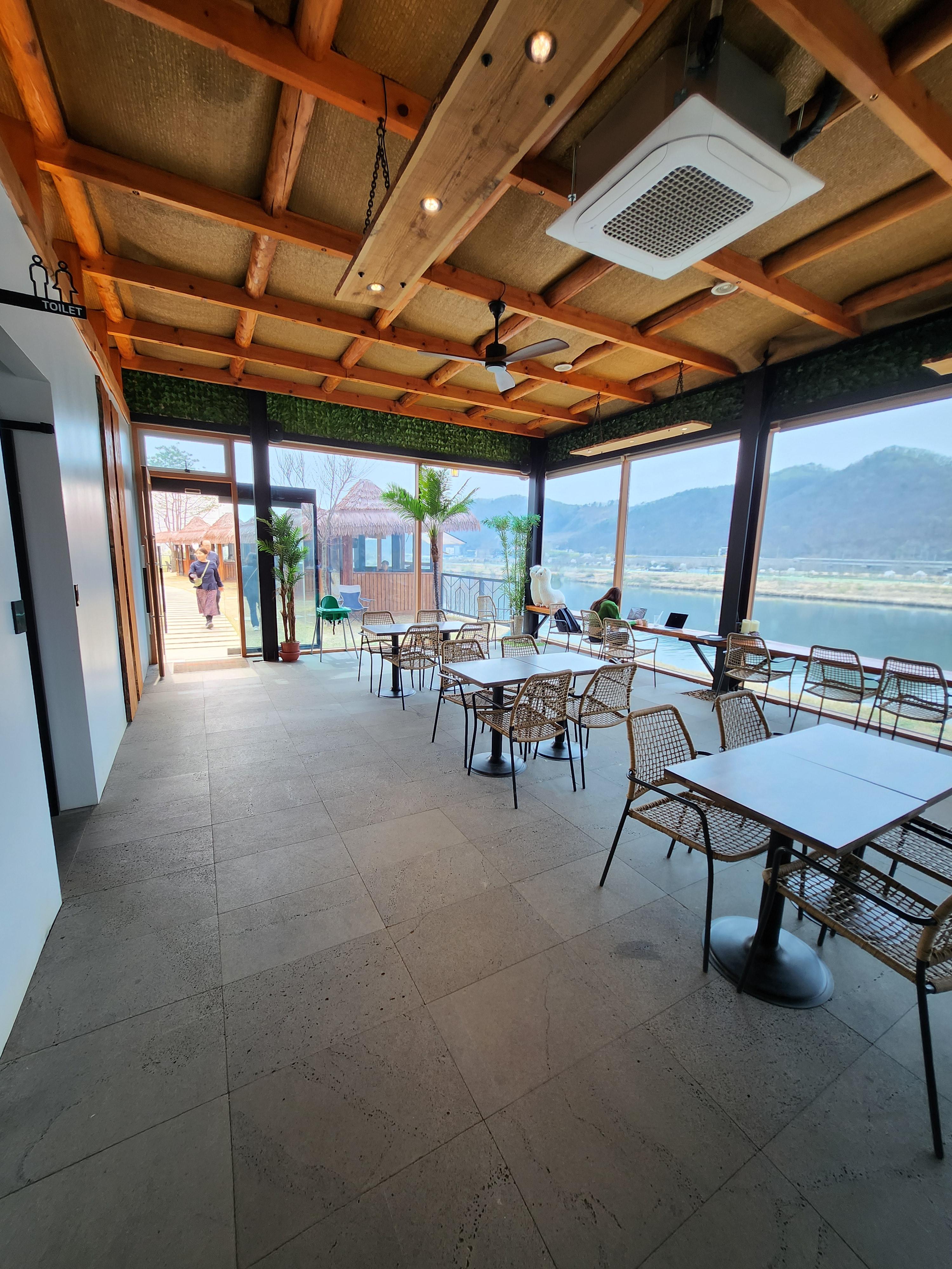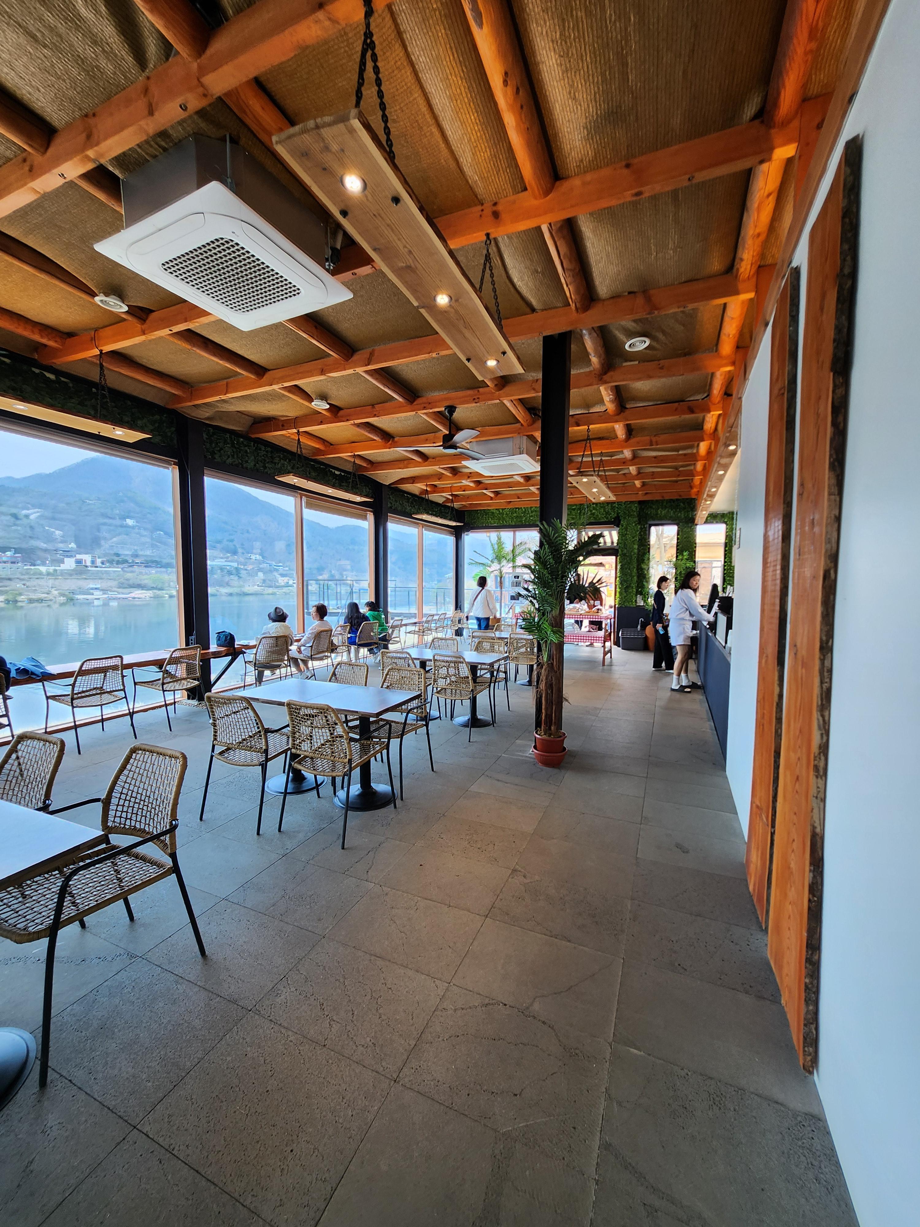 본관에도 테이블이 꽤 있다. 북한강이 다 보여서 뷰가 참 좋네.