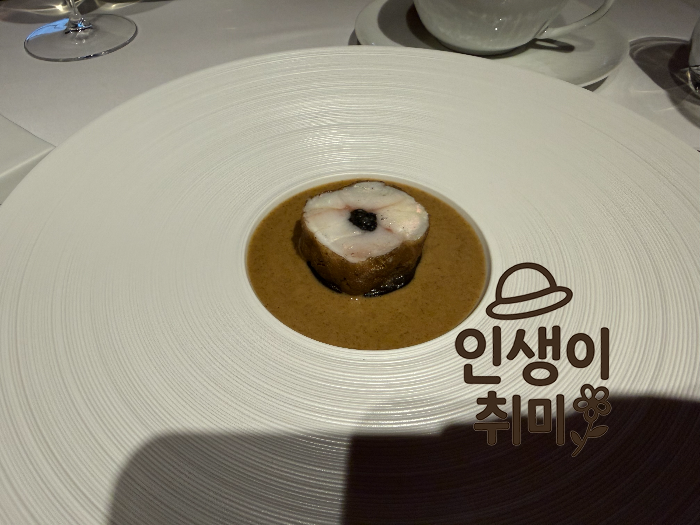 하얀 접시 중앙에 동그랗게 담긴 아귀살 위로 진한 트러플 소스가 둘러져 있는데, 향이 정말 진했습니다.