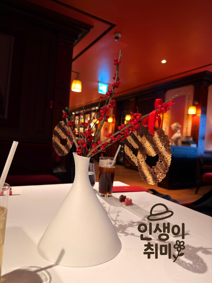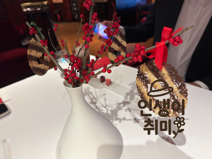크리스마스 리스 모양의 초콜릿 프레첼과 빨간 열매로 장식된 초콜릿 나무가 함께 나오는데, 보는 것만으로도 힐링이 되더라고요.