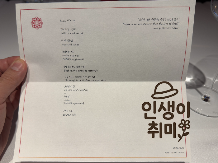 빨간색 고급 커버의 메뉴판을 펼치면 "Dear, ******"이라고 제 이름이 적혀 있더라고요.