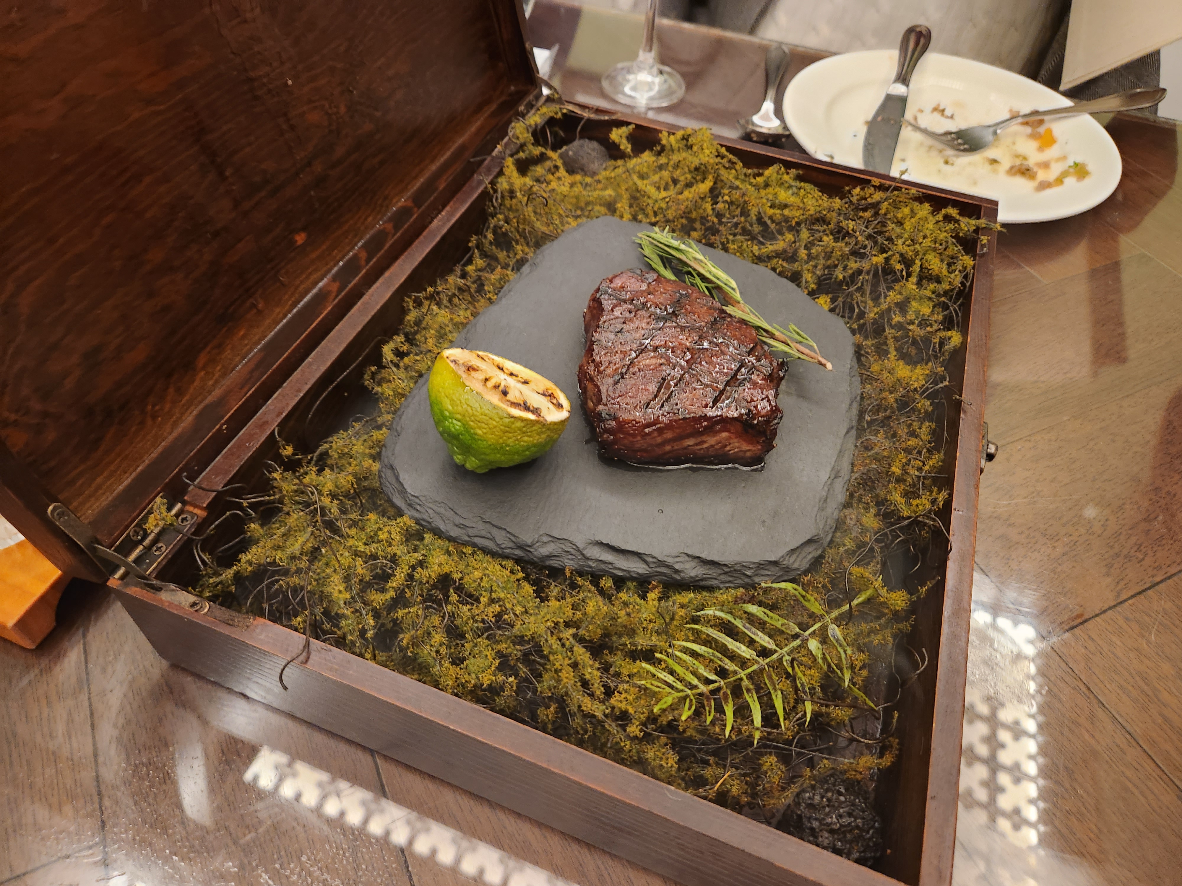 무슨 티박스 같은걸 들고와서 열어주는데 훈연 향기와 함께 스테이크 등장.