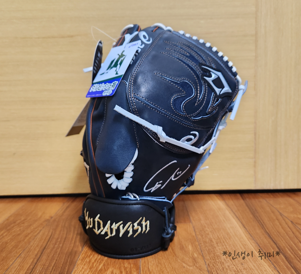 아식스 마크랑 다르빗슈 마크가 웹에 새겨져 있고, 싸인이 자수로 박혀있다