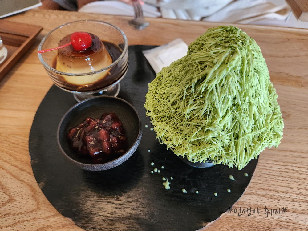 말차빙수의 시원함과 커스타드푸딩의 부드러움이 절묘한 조화를 이루어 완벽한 디저트 타임을 만들어 줬죠.