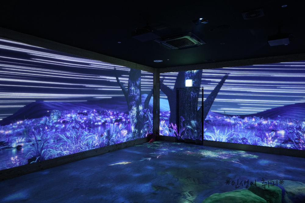 오션. 고래가 왔다갔다 하는 공간인데, 벽에 비치는 미디어는 계속 바뀐다.