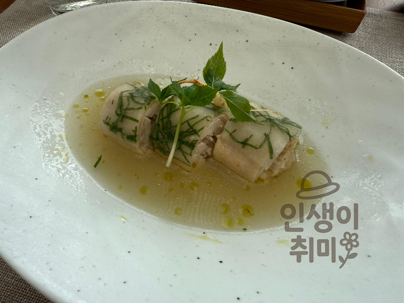닭죽은 일반적인 죽 형태가 아니라 롤 형태로 말아서 허브와 함께 낸 요리예요.