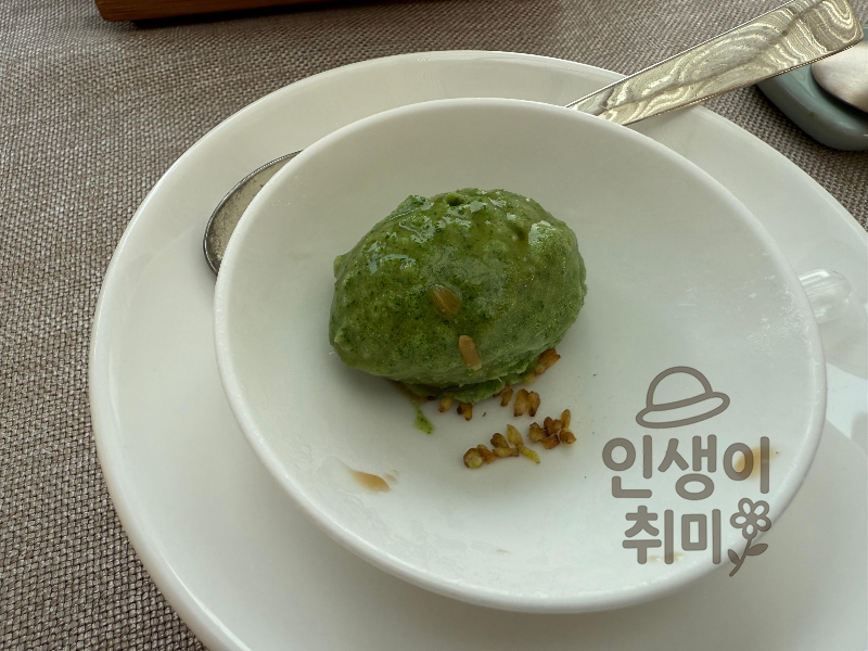 메인과 식사 사이에 미나리 소르베가 나왔어요. 미나리 특유의 풀 향이 은은하게 나면서 시원하고 상큼한 맛이에요.
