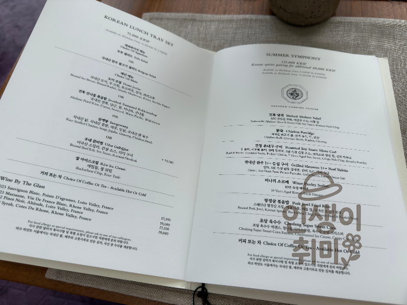 메뉴는 크게 Korean Lunch Tray Set과 Summer Symphony 코스가 있었어요. 저는 Summer Symphony 코스를 주문했는데, 여름 제철 식재료를 활용한 코스라고 해요. 가격은 135,000원이고, 술 페어링은 추가 60,000원이에요.
